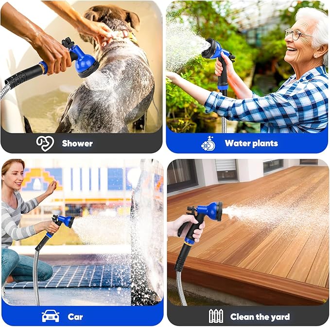 - 10-Mode Spray Nozzle: This water hose is equipped with a blue nozzle that offers 10 unique spray modes, giving you the perfect setting for everything from washing your car to watering plants, showering your pets, or even splashing around in the yard. With its ergonomic, non-slip handle and durable metal ring, this nozzle is designed for comfort and ease.