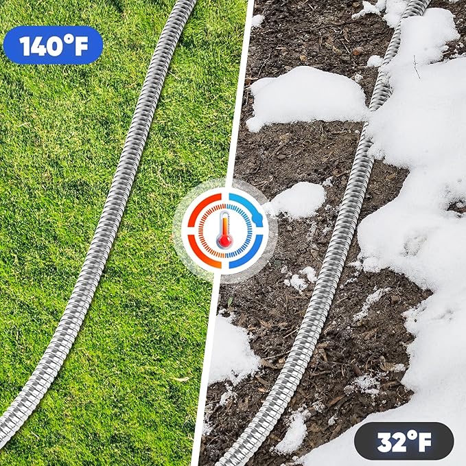 - No Kinks, Easy Storage: This metal hose is designed to prevent kinking and ensure a consistent water flow while working. It’s built to withstand temperatures ranging from 32°F to 140°F, making it ideal for various weather conditions. After use, you can drain the water and either roll it up with a hose reel or hang it on a hook for keeping the yard tidy.