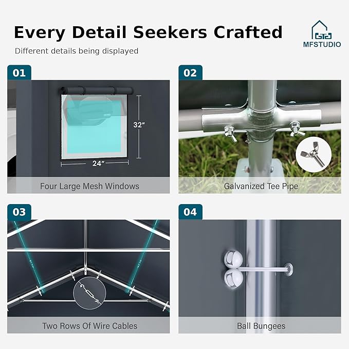 - Stable Construction: Tent car port Built with sturdy galvanized steel pipes, The joint adopts a spray molding process that prevents chipping, peeling, rust, and corrosion.the heavy duty garage shelter with 4 roof fasteners and 4 S hook make sure the storage cover fits the frame tightly, windproof and more stable