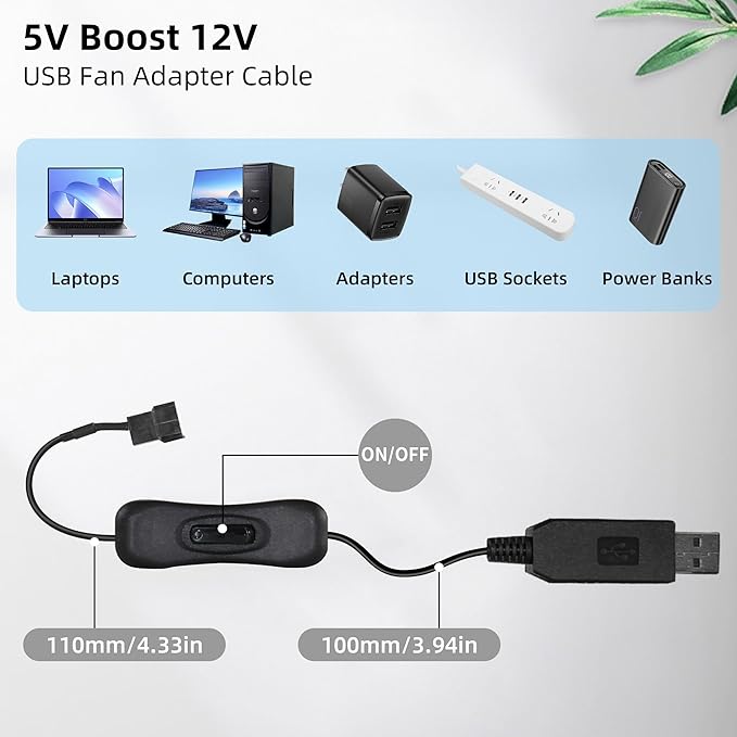 - 【5V-to-12V Adapter】 Includes a 5V USB boost 12V Cable(no PWM function), enabling compatibility with laptops, power banks, and USB chargers while boosting fan performance.