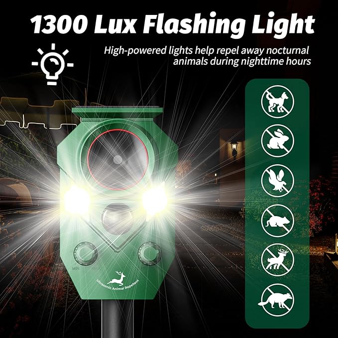 - Humane Design Animal Repellent - This ultrasonic pest repeller uses high-frequency sound waves and flashing lights to make animals uncomfortable, prompting them to leave quickly. Itโs highly effective at deterring cats, dogs, coyotes, raccoons, deer, and other stray animals.