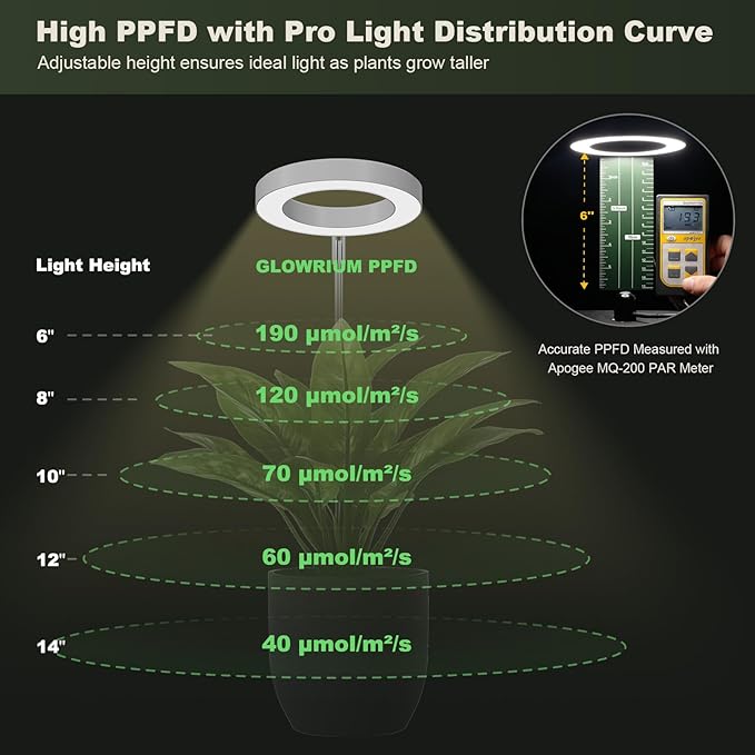 - 320-800nm Wavelengths: Ring-shaped LEDs replicate natural sunlight with a full spectrum of wavelengths from 320 to 800 nm, supporting all growth stages—from seedlings to full blooms—ideal for herbs, succulents, orchids, and other light-loving plants.