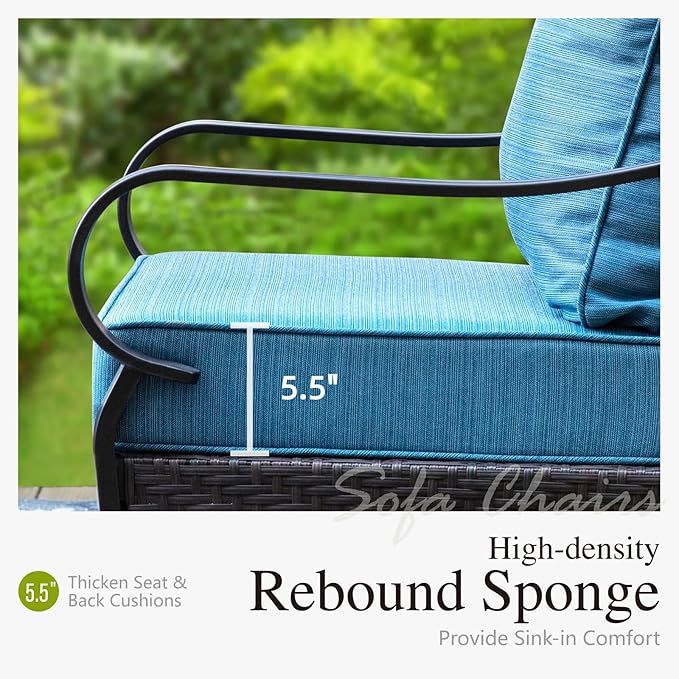 - Ultimate Comfort with Thick Cushions: Featuring 5.5-inch thick cushions, this conversation patio furniture Set ensures maximum comfort and support. The extra-wide, deep seats and high backrest offer a relaxed, cozy experience, perfect for lounging or engaging in long conversations. Enjoy outdoor comfort like never before with this stylish and comfortable set.