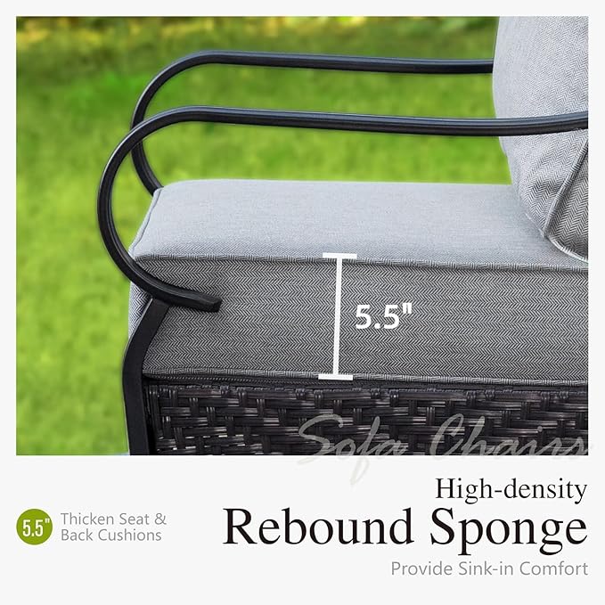 - Ultimate Comfort with Thick Cushions: Featuring 5.5-inch thick cushions, this conversation patio furniture Set ensures maximum comfort and support. The extra-wide, deep seats and high backrest offer a relaxed, cozy experience, perfect for lounging or engaging in long conversations. Enjoy outdoor comfort like never before with this stylish and comfortable set.