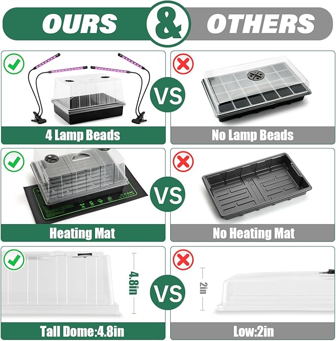- 【All-in-One Seed Starter Kit】Kickstart your gardening journey with RooTrimmer complete seed starting kit, featuring a sturdy bottom tray, 5-inch humidity dome, full-spectrum grow lights, and a waterproof 1020 heat mat. Designed for fast and healthy germination, everything you need in one kit—just plant, grow, and watch your seedlings thrive!