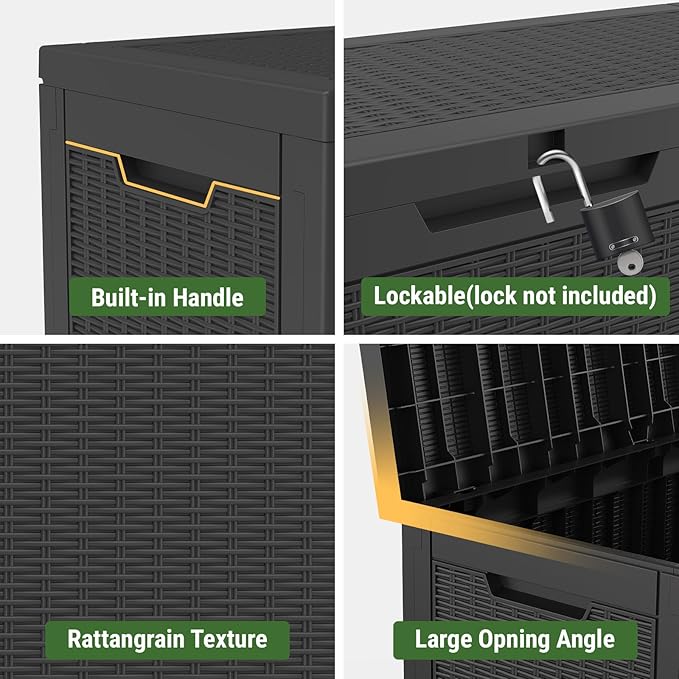 - 【Portable & Lockable】- Designed with built-in side handles on both side, this deck box is easy to lift and move, whether you're rearranging outdoor furniture, storing seasonal items, or bringing it indoors, the secure lockable lid adds an extra layer of protection, ensuring your belongings stay safe and secure.