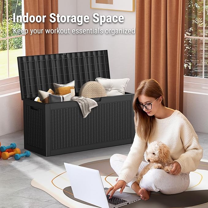 - 【Built to Withstand Any Weather】- Constructed from premium PP resin with an elegant woodgrain finish, this deck box is UV-resistant and waterproof, ensuring that your belongings stay protected and dry year-round in any weather like rain, sun, and seasonal changes, requires minimal maintenance and guarantees long-lasting performance