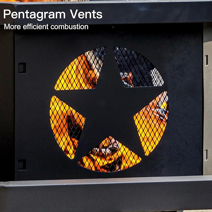 - [Beautiful & Safe Design] Panovue fire pit is unique octagon which is complement to any style yard. Wood fire pit for outside are coated with high-temperature powder for durability and rust resistance. Firepit has 4 sturdy legs and enough weight can improve stability on uneven ground. The mesh screen has beautiful star pattern which catches firelight for creating fun shadows, also it can avoid sparks and embers from flying out. Fire poker lets you to move wood safely.