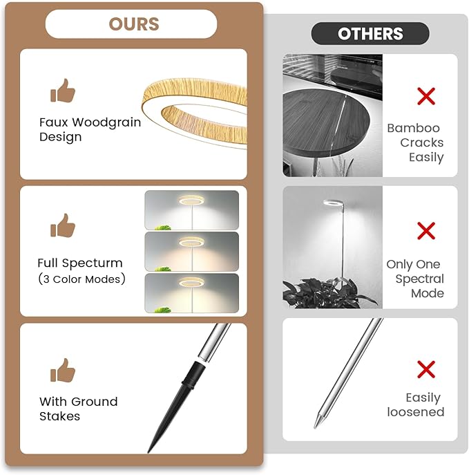 - Elegant Faux Woodgrain Design: This halo grow light has a unique faux woodgrain design that complements any interior space. Compared with other plant lamps using bamboo materials, ours will not crack or fall off. Whether itโs used as a light for indoor plants or adding a stylish content to your home decor, this plant lamp is both practical and beautiful
