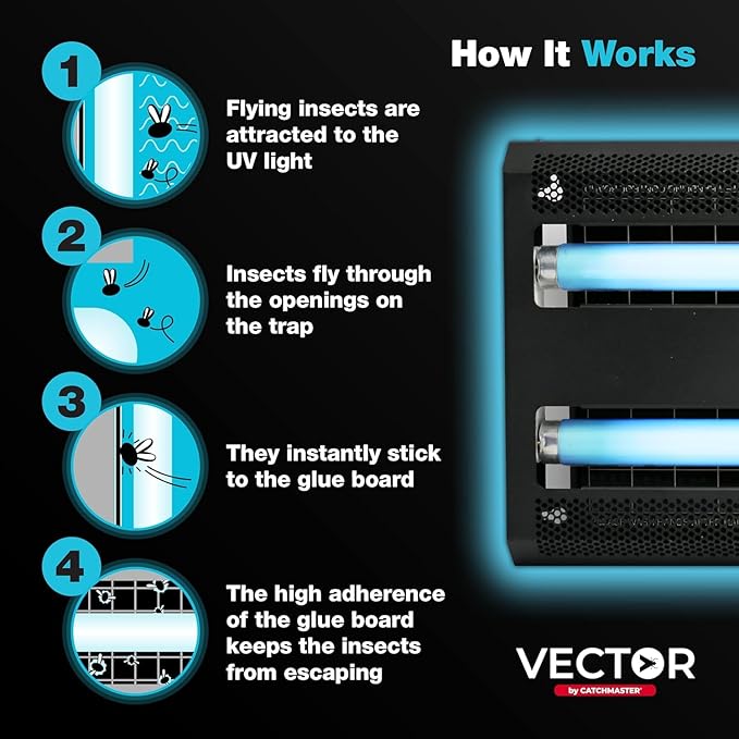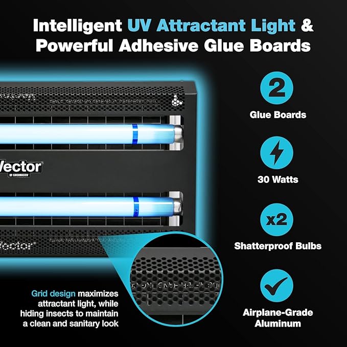 - INDUSTRIAL STRENGTH UV TRAP: Catchmaster's Insect Vector 30 Light Trap is remarkably discreet and undemanding to maintain. It's made with airplane-grade aluminum casing and an industrial-strength design for increased durability. This ultra-sturdy indoor fly trap for home comes with a replaceable glue board and 2 shatterproof 30-Watt bulbs (Philips TL-D 15W Actinic BL)