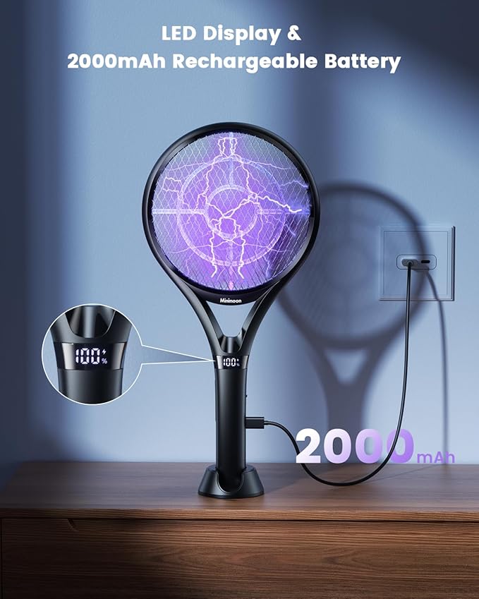 - Digital Display Screen - Minimoon electric fly swatter racket features a clear LED display that shows remaining battery life and operational status. Unlike other fly zapper with only power indicators, our design offers greater convenience and user-friendly functionality