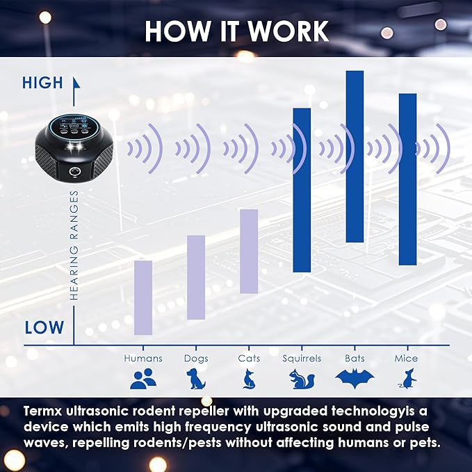 - [β Silent & Safe: 25kHz+ Frequencies]: Completely safe for humans/pets with >25kHz waves + 75% less energy vs 10W units (2.5W eco-friendly ultrasonic squirrel repeller).