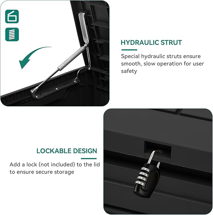- Versatile and Secure: Our resin storage box is designed for both indoor or outdoor use, suitable for storing patio furniture cushions, gardening tools, pool accessories, and more; The deck box with lock design ensures your items stay safe and secure(Locks not included)