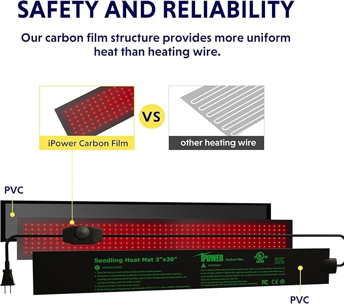 - Heating film structure: heating film ensure uniform heating. Warms root area 10-20℉ (5-11℃) over the ambient air temperature, which will increase the success of seedlings and cuttings