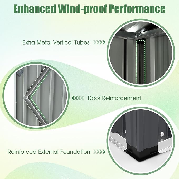 - Enhanced Stability & Durability: The heavy-duty storage house is reinforced with sturdy vertical tubes and an external foundation, enhancing the overall strength and stability of the structure. Moreover, the protective plastic corners and screw covers are less prone to be damaged for longevity.
