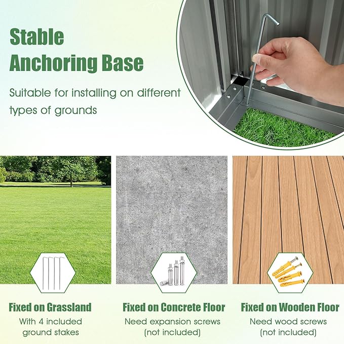 - Multiple Fixation Options: Thanks to the anchoring base, the outdoor tool shed can be fixed on grassland with 4 included ground stakes, fixed on cement floor with expansion screws(not included) or fixed on wood floor with wood screws(not included) for added stability. Plus, 2 pairs of gloves offer protection against sharp edges during assembly or use.