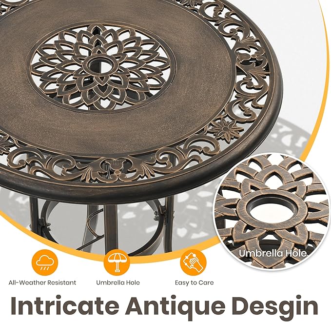 - 【Vintage Patterns Design】Our outdoor bar stools with exquisitely carved vintage - style patterns on the surface. These patterns add a unique elegance and charm to your outdoor dining environment. Meanwhile, the cast - aluminum chairs in this patio bistro set are designed with practicality in mind. They are lightweight, allowing you to move them around effortlessly as you like. The table is equipped with a practical umbrella hole. You can match it with a sunshade umbrella as needed, creating a cool and comfortable space under the hot sun and greatly enhancing the coziness of outdoor living.