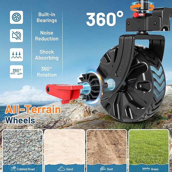 - All-Terrain Performance: 360Β° rotating PVC wheels with bearings ensure smooth movement on sand, grass, or slopes. Ergonomic telescoping ABS handle adjusts from 23.2-32.7 inches with secure brakes and storage cover.