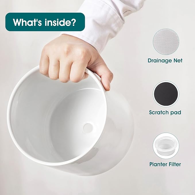 - 【Smart Drainage System】 Central bottom drainage hole + 3 essential accessories for hassle-free care: Mesh Filter prevents soil leakage and keeps surfaces clean. Anti-Scratch Pads protect tables and floors from scratches. Silicone Drain Plug lets you control water flow—no messy spills! Switch between drainage and water storage modes with ease.
