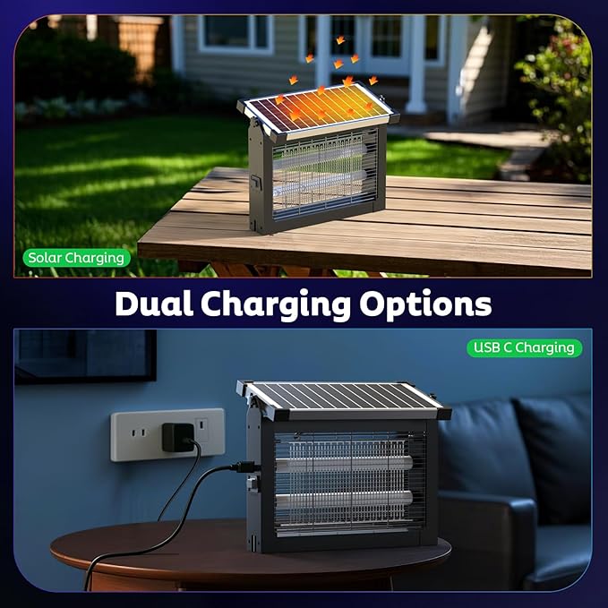 - Dual Charging Options: Solar & USB Powered: This solar powered mosquito zapper features a 10W 5V monocrystalline solar panel and a 4,000mAh rechargeable battery for eco-friendly, energy-efficient operation. Charge it with direct sunlight for sustainable use, or quickly recharge via USB using the included 4ft USB-C cable in just 3-4 hours. Enjoy up to 12 hours of continuous protection on a full charge. Ideal for both indoor and outdoor use, whether at home, in an RV, camping, or in your backyard