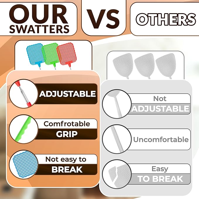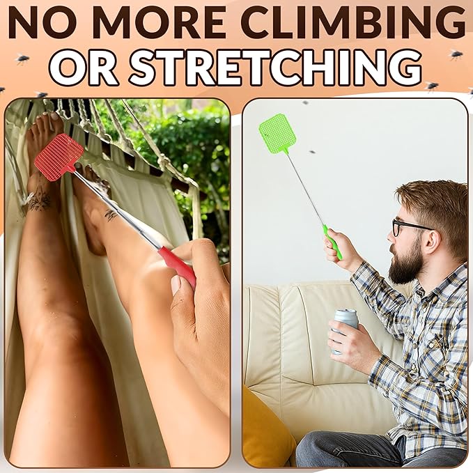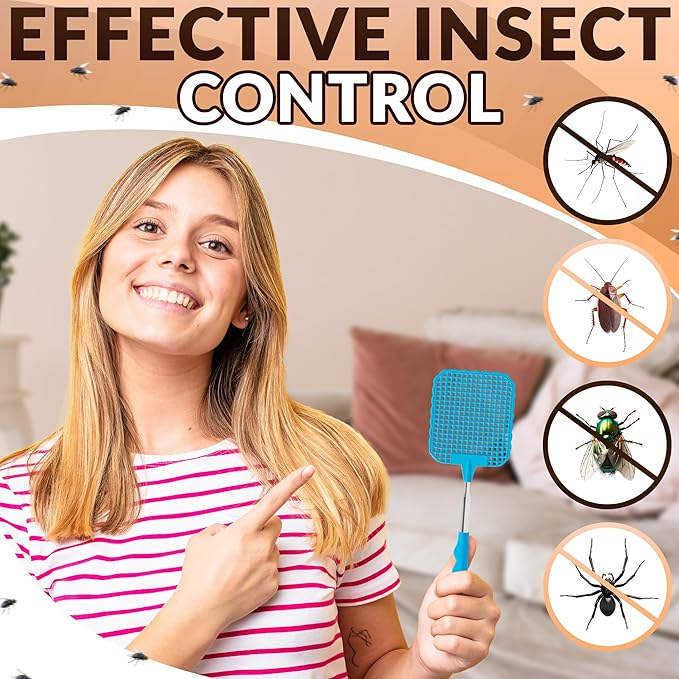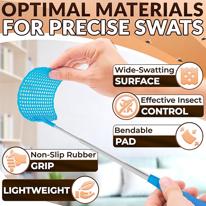 - High Quality Fly Catcher Indoor: The attacking paddle of the indoor fly killer swatter is made of durable and flexible plastic. The handle bar of roach killer fly swatter is made of extendable telescopic steel bar. The attacking paddle of telescoping fly swatter is smooth and clean which does not scratch or damage your window screen and furniture surfaces.