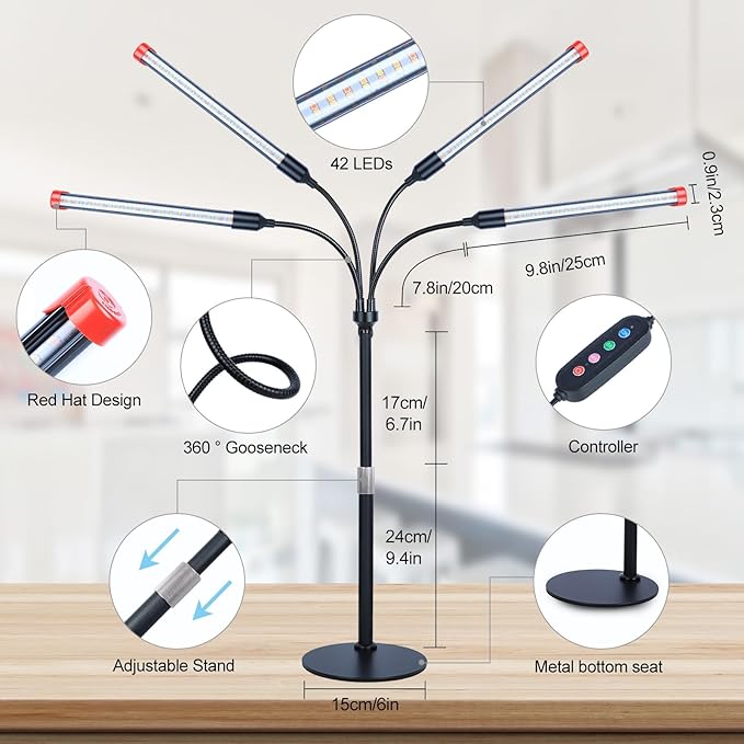 4-Head Desk Grow Lights for Indoor Plants, Seed Starting, Bonsai, Succulent, Cactus with Timer, 36W Table Top LED Plant Growing Lamps, Enough High-Intensity Like Sun, Best Gift for Plants Lover