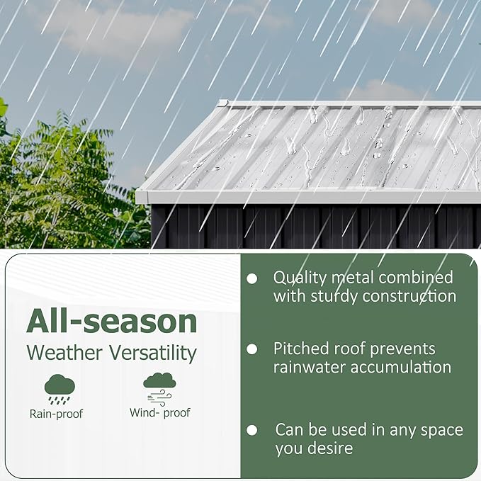 - 【Premium Material Selection】The garden shed boasts high-quality metal that is both waterproof and UV-resistant. Its sturdy construction guarantees dependable protection against all weather conditions, enduring even the toughest environments. Selection of Premium Materials.