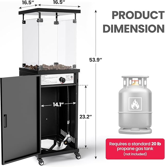 - Easy to Move: Measuring 16.5" x 16.5" x 53", this portable outdoor heater is compact and lightweight, making it easy to move and set up. It stands on four universal wheels, two of which are lockable for added stability. The adjustable feet ensure stability even on uneven surfaces. Perfect for any occasion, it creates a warm, inviting atmosphere whether you’re hosting a party or relaxing with family.
