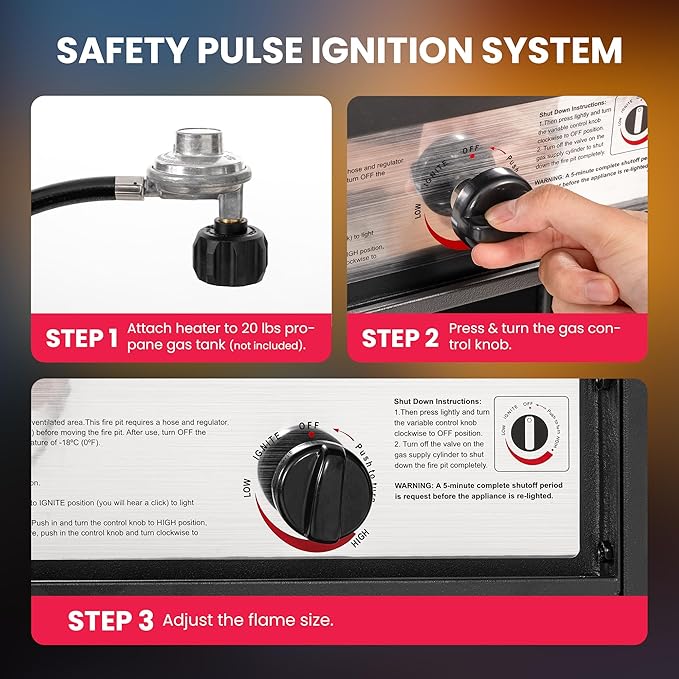 - Safe and Easy Ignition: To use, simply connect the patio heater to a 20 lbs propane tank (not included), turn the gas control knob, and press the ignition button. You can adjust the flame size to your preferred heat. For added safety, the heater automatically shuts off if it’s tipped over, and the flame-out protection ensures peace of mind. It’s the perfect choice for creating a cozy and safe atmosphere at your family gatherings.