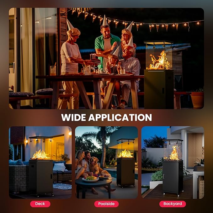 - Versatile and Elegant Design: This outdoor heater not only keeps you warm but also adds a stylish touch to your gatherings. Enjoy the 360° view of the soft golden flames through the glass panels, perfect for lighting up your patio, garden, or deck. It’s easy to assemble and use with the included manual, making it a great addition to any outdoor space.