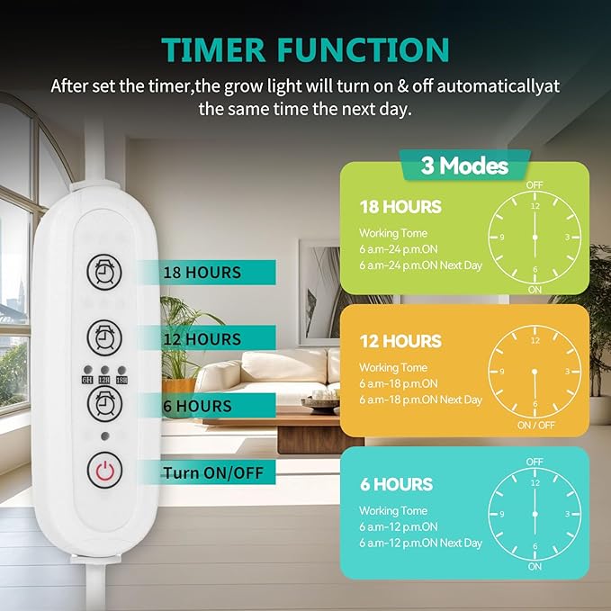 - 【Timing Settings】This grow light equipped to meet the varying needs of your plants.The automatic timer function offers 6h/12h/18h cycles (must always be plugged in),then next day will automatically turn on or off at the same time you set yesterday,preventing overexposure or underexposure to plants.