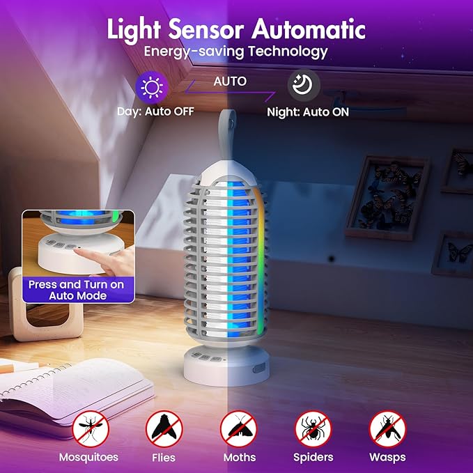 - High-Capacity Battery & Portability: Equipped with a 4000mAh battery, this bug zapper provides up to 16 hours of continuous use on a single charge via Type-C USB. Portable design allows you to place this mosquito zapper anywhere without the hassle of cords, making it perfect for both indoor and outdoor use