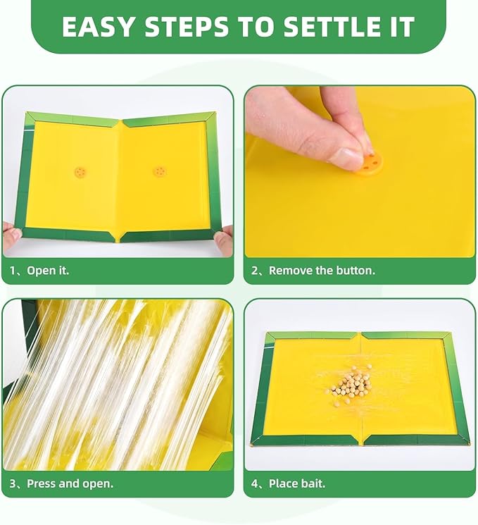 - Versatile: The flexibility of these mouse sticky traps enables placement in various locations, including homes, workplaces, gardens, shelves, kitchens, basements, floors, and windows. They can also be hung vertically to effectively capture and control a wide range of pests such as mice and house flies