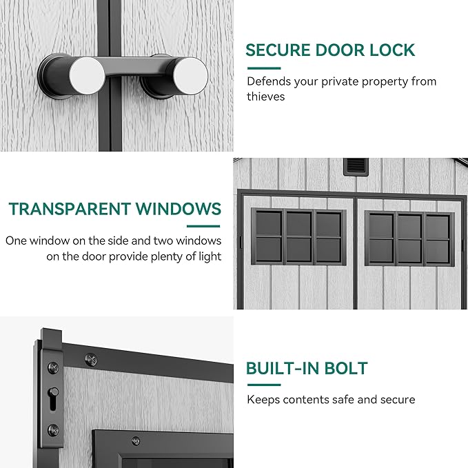 - Enhanced Security and Natural Light: The plastic storage shed includes lockable double doors with transparent windows for security and style; The translucent roof panel allows natural light in, illuminating the interior and making it easier to find items