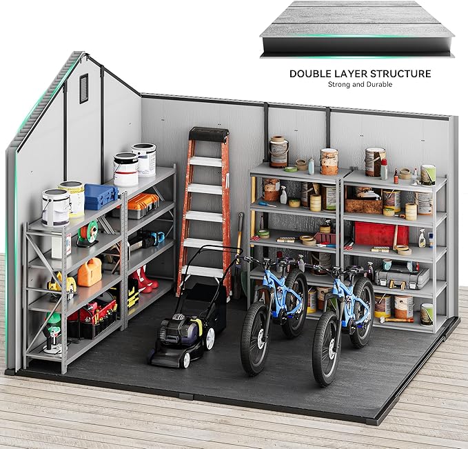 - Rugged Outdoor Strength: Built to last, this large storage shed features a galvanized steel frame and durable PP panels for sturdiness and weather resistance; The built-in floor adds stability and keeps items from ground-level damage