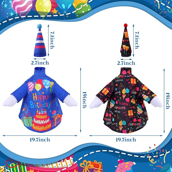 - Birthday Goose Outfits: the package contains 2 sets different styles of porch goose birthday outfits, including 2 pieces of clothing, 2 hats and 2 ties, which is convenient for you to match and decorate; Use this birthday style lawn goose clothes to show your feelings; Please note: lawn goose are not included, you can use an existing statue or find one that suits your preference