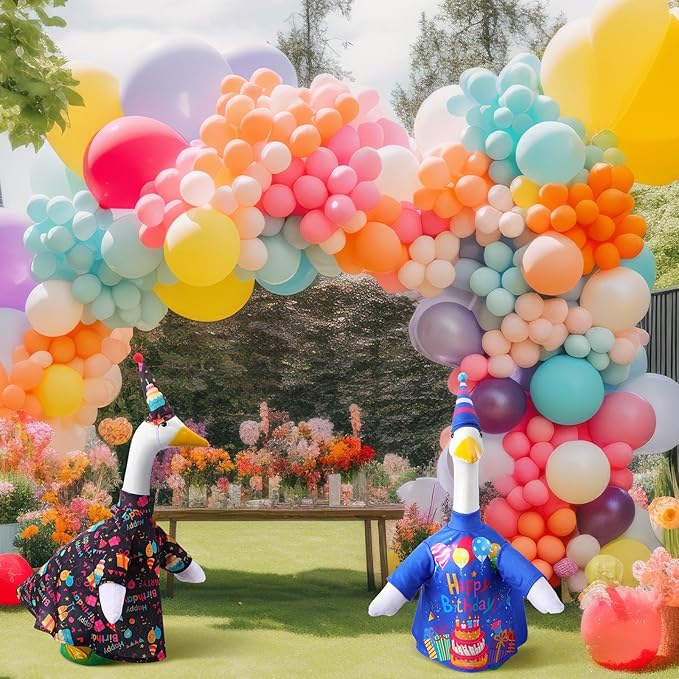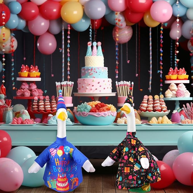 - Birthday Style Goose Outfits Decor: these birthday style porch goose outfits are designed with an adorable and beautiful aesthetic in mind; The vibrant colors to catch everyone's attention, adding a visually engaging detail to your lawn, garden, or backyard; Dress up your cement or plastic goose in style and watch how they attract admiration