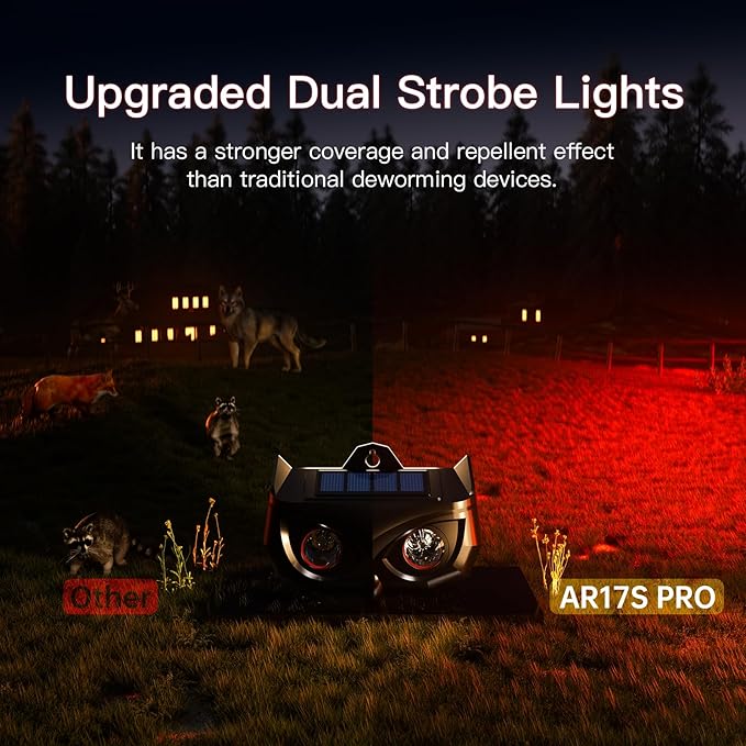 - Upgraded Dual-frequency Red Flashing Lights: Animal repellent outdoor is equipped with two enhanced and upgraded dual-frequency red flashing lights, which simulate the eyes of large predators more realistically, with greater coverage than traditional insect repellers and Stronger repellent effect. Easily drive away any annoying unwanted guests and protect your property more effectively.