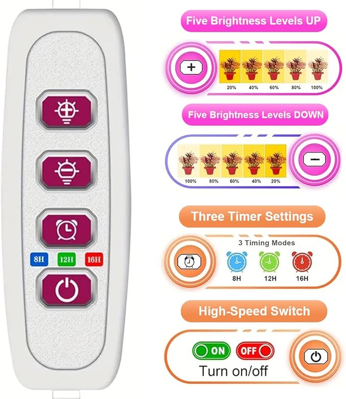 - 8/12/16H Timer for Targeted Growth: Pre-set light cycles to match plant needs—8H for short-day plants, 12H for general use, 16H for rapid growth. Use buttons to adjust brightness
