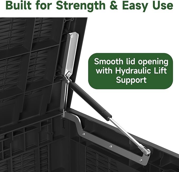 - ENHANCED SAFETY FEATURES - The EasyUp storage box features a hydraulic rod that allows for smooth lid opening and closing, reducing the risk of accidental pinching. The built-in locking mechanism adds an extra layer of security, making it ideal for safeguarding outdoor valuables.