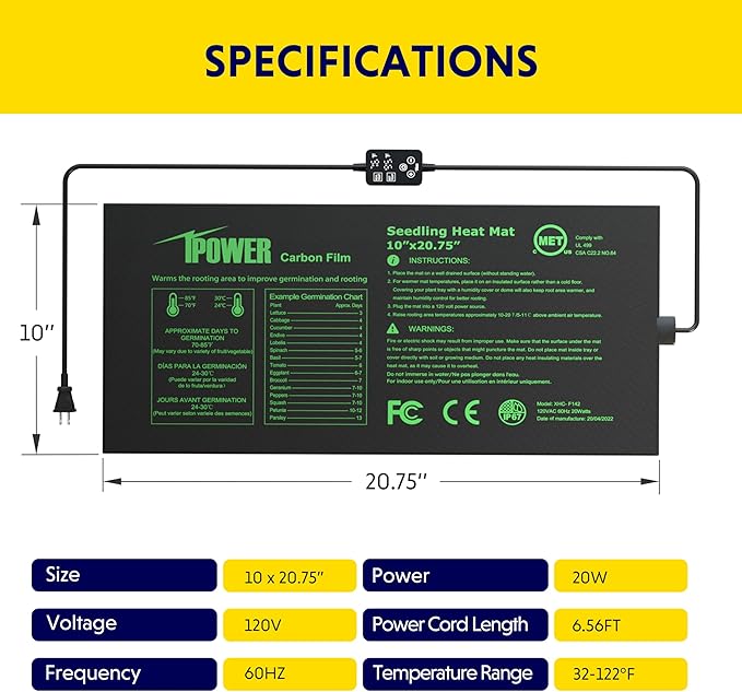 - Durable & Waterproof for Safe Use: Made with high-quality materials and meets MET standards, this waterproof seedling heat mat has an IP67-rated surface for easy cleaning. Insulated wiring and reinforced connections enhance safety and durability