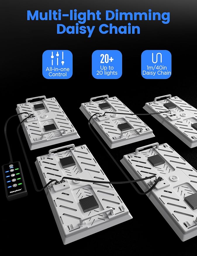 - 【Powerful and Versatile Connectivity】: Designed for maximum convenience, our grow light system supports seamless daisy-chaining of up to 20 lights, allowing you to illuminate large indoor gardens with ease. Whether you're nurturing a small seedling tray or an extensive indoor plant collection, the synchronized setup ensures uniform lighting across all connected units.