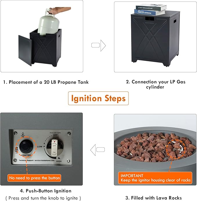 - Push-Button Ignition: Simply press and turn the metal knob to ignite the propane fire pit, featuring adjustable flame control. The fire pit table comes with a pre-attached 10-foot commercial-grade propane hose. A standard 20 lb propane tank (not included) is required externally.