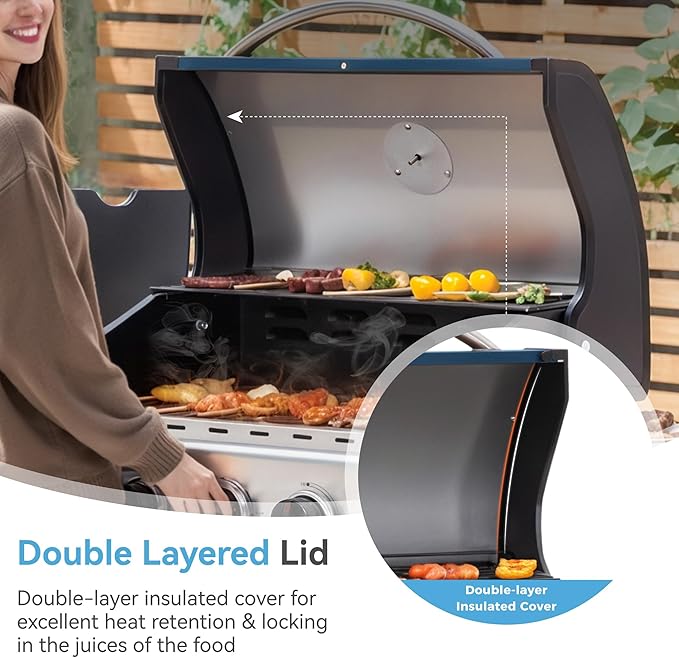 - PORCELAIN-ENAMELED CAST IRON GRILL GRATES: Powered by liquid propane gas, this outdoor grill heats up to 500°F in just under 10 minutes and maintains even heat. The easy-to-clean cast iron grates are Porcelain-Enameled to resist rust, durable and help you achieve delectable grill marks