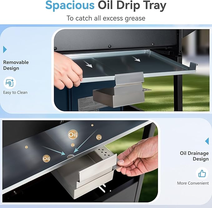 - Special Feature : Built-In Thermometer, Heavy Duty, Removable Grease Tray, Rust Resistant, Warming Rack