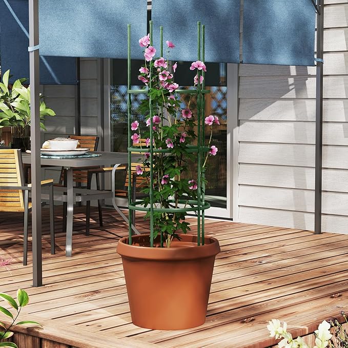 - Advanced PE Coated Metal Frame: Crafted from PE-coated metal poles, the 3 pack garden trellises are sun-proof, non-deformable, and rustproof for long service life. Compared to others, the unique material makes our tomato support cage resistant to burning plants, thanks to their cooler surface.