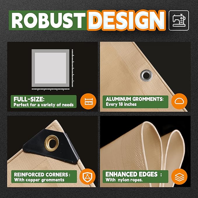- 【FINISHED SIZE + 2025 NEW UPGRADE】The size of RAINDEWAY outdoor tarp is actual size that can be used, you will receive a full size tan poly tarp covers. If you want to have a nice and durable thick tan tarp waterproof, Please give RAINDEWAY a chance to prove that this 12mil tan tarpaulin is a good choice