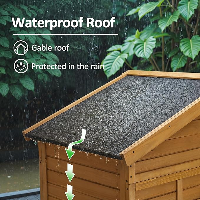 - Waterproof Roof: This roof is covered with asphalt, making it rainproof; The sloping design prevents water accumulation, allowing rain and snow to slide off, extending the life of the patio cabinet
