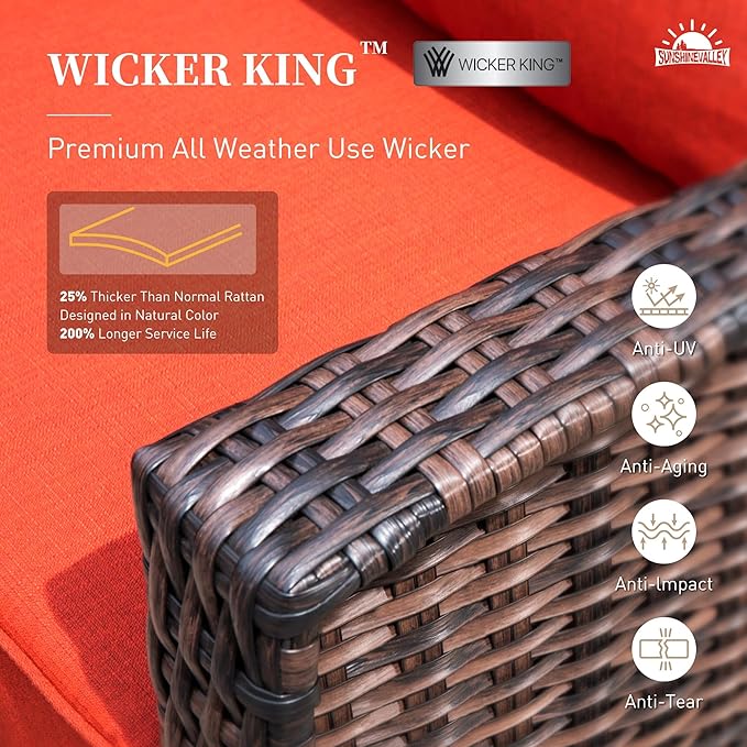 - WICKER KING RATTAN: The premium brown rattan has 100% UV protection and is reinforced on both rattan edges, which is 25% thicker than normal rattan and can prolong the service hours of the rattans. With this 100% handcrafted high quality rattan, this sofa couch set has great performance in all weather like rain, intense sun exposure, suit for year-round outdoor use