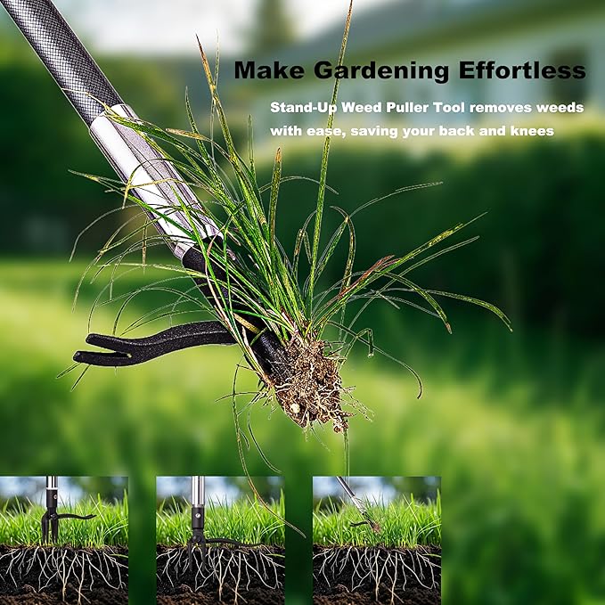 - Comfortable To Use:Eliminate back pain with 42" stand-up weed puller ergonomic design! Remove dandelions, thistles & deep-rooted weeds standing upright - no more bending, kneeling or strenuous pulling,Great for seniors to use and enjoy the joys of gardening